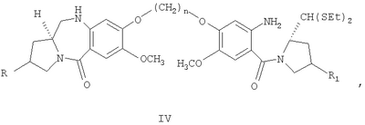 Диэтилтиоацеталь (4R)-гидрокси-(2S)-N-{4-[5-(7-метокси-(11аS)-1,2,3,10,11,11а-гексагидро-5Н-пирроло[2.1-c][1.4]бензодиазепин-5-он-8-илокси)пентилокси]-5-метокси-2-нитробензоил}пирролидин-2-карбоксальдегида III (732 мг, 1,0 ммоль) растворяли в дихлорметане (5 мл), метаноле (10 мл) и добавляли SnCl2·2H2O (1,124 г, 5,0 ммоль), смесь кипятили с обратным холодильником 1,5 ч. Затем рН реакционной смеси осторожно доводили до 8 с помощью насыщенного раствора NaHCO3 и смесь экстрагировали этилацетатом (3х20 мл). Объединенную органическую фазу сушили над Na2SO4 и упаривали в вакууме, получая неочищенный диэтилтиоацеталь (4R)-гидрокси-(2S)-N-{4-[5-(7-метокси-(11аS)-1,2,3,10,11,11а-гексагидро-5Н-пирроло[2.1-c][1.4]бензодиазепин-5-он-8-илокси)пентилокси]-5-метокси-2-аминобензоил}пирролидин-2-карбоксальдегида формулы IV.