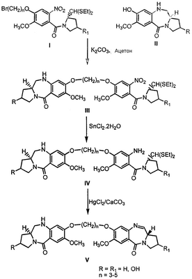 Таким образом, данный способ относится к способу получения пирроло[2.1-с][1.4]бензодиазепинов формулы V, где R представляет собой Н, ОН, R1 представляет собой Н, ОН и n принимает значения от 3 до 5, который включает: взаимодействие диэтилтиоацеталя (25)-N-[4-(n-бромалкокси)-5-метокси-2-нитробензоил]пирролидин-2-карбоксальдегида, где R1 представляет собой Н, ОН и n принимает значения 3-5, соединений формулы I, со вторичным амином формулы II, где R представляет собой Н и ОН, в присутствии неорганических слабых оснований, подобных К2СО3, CsCO3 и ВаСО3, в присутствии апротонных смешивающихся с водой органических растворителей, подобных ацетону, ТГФ и ДМФА, кипячение с обратным холодильником в течение вплоть до 12-48 часов, выделение диэтилтиоацеталя (2S)-N-{4-[n-(7-метокси-(11aS)-1,2,3,10,11,11а-гексагидро-5H-пирроло[2.1-с][1.4]бензодиазепин-5-он-8-илокси)алкилокси]-5-метокси-2-нитробензоил}пирролидин-2-карбоксальдегида, формулы III, где R представляет собой Н, ОН, R1 представляет собой Н, ОН и n принимает значения от 3 до 5, обычными способами, восстановление вышеуказанных нитросоединений формулы III с помощью SnCl2·2H2O в присутствии органического растворителя при температуре вплоть до кипячения с обратным холодильником, выделение диэтилтиоацеталя (25)-N-{4-[n-(7-метокси-(11аS)-1,2,3,10,11,11а-гексагидро-5H-пирроло[2.1-с][1.4]бензодиазепин-5-он-8-илокси)алкокси]-5-метокси-2-амино-бензоил}пирролидин-2-карбоксальдегида формулы IV, где R представляет собой Н, ОН, R1 представляет собой Н, ОН и n принимает значения от 3 до 5, известными способами, взаимодействие вышеуказанного аминосоединения формулы IV с последующим снятием защитных групп традиционным способом с получением новых пирроло[2.1-с][1.4]бензодиазепинов формулы V, где R представляет собой Н, ОН, R1 представляет собой Н, ОН и n принимает значения от 3 до 5.