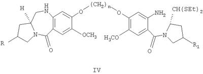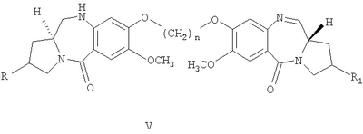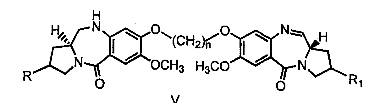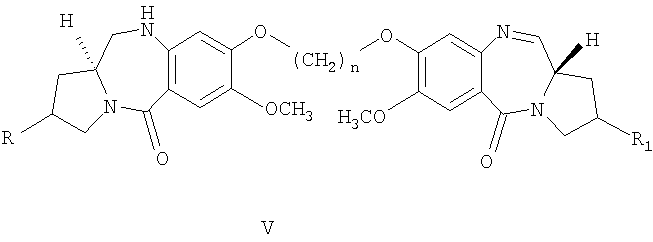 Некоторые типичные соединения формулы V данного изобретения представлены ниже: 7-метокси-8-{3-[7-метокси-(11aS)-1,2,3,10,11,11а-гексагидро-5Н-пирроло[2.1-с][1.4]бензодиазепин-5-он-8-илокси]пропокси}-(11аS)-1,2,3,11а-тетрагидро-5Н-пирроло[2.1-с][1.4]бензодиазепин-5-он;