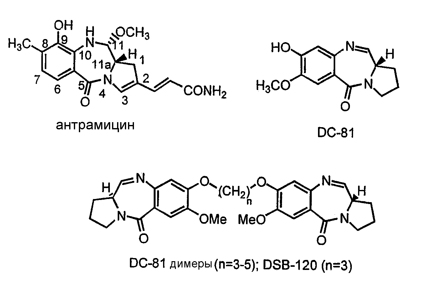 Соединения данного изобретения отличаются от представителей того же типа, С-8 связанных вторичных аминов, замещением фенольного водорода (11аS)-8-гидрокси-7-метокси-1,2,3,11а-тетрагидро-5Н-пирроло[2.1-c][1.4]бензодиазепин-5-она (DC-81).