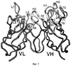Последовательности VL и VH доменов (Фиг.5А и В) используют для построения компьютерной графикой модели доменов VL-VH мышиных 9F3 (Фиг.7). Данную модель используют для определения остатков каркасных областей, которые должны быть встроены в гуманизированное антитело. Создают также модель гуманизированного F(ab), чтобы проверить правильность отбора остатков каркасной области мыши. Построение моделей осуществляют так, как описано раньше (Carter et al., [1992] выше; Werther et al., [1996] выше).