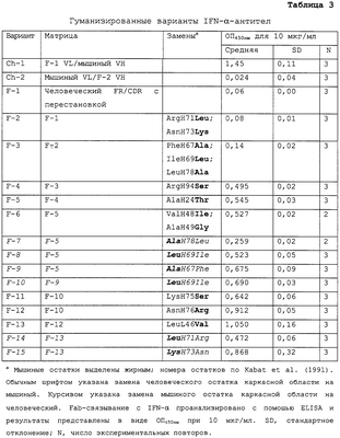 Кроме того, представлено моноклональное антитело против IFN- человека, которое существенно связывает тот же эпитоп в подтипах 1, 2, 4, 5, 8, 10 и 21 IFN- человека, который связывается мышиным моноклональным антителом 9F3 против IFN- человека, либо гуманизированным или химерным его вариантом. Также представлено моноклональное антитело против IFN- человека, которое конкурирует с мышиным моноклональным антителом 9F3 против IFN- человека за связывание с каждым из подтипов 1, 2, 4, 5, 8, 10 и 21 IFN- человека.