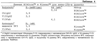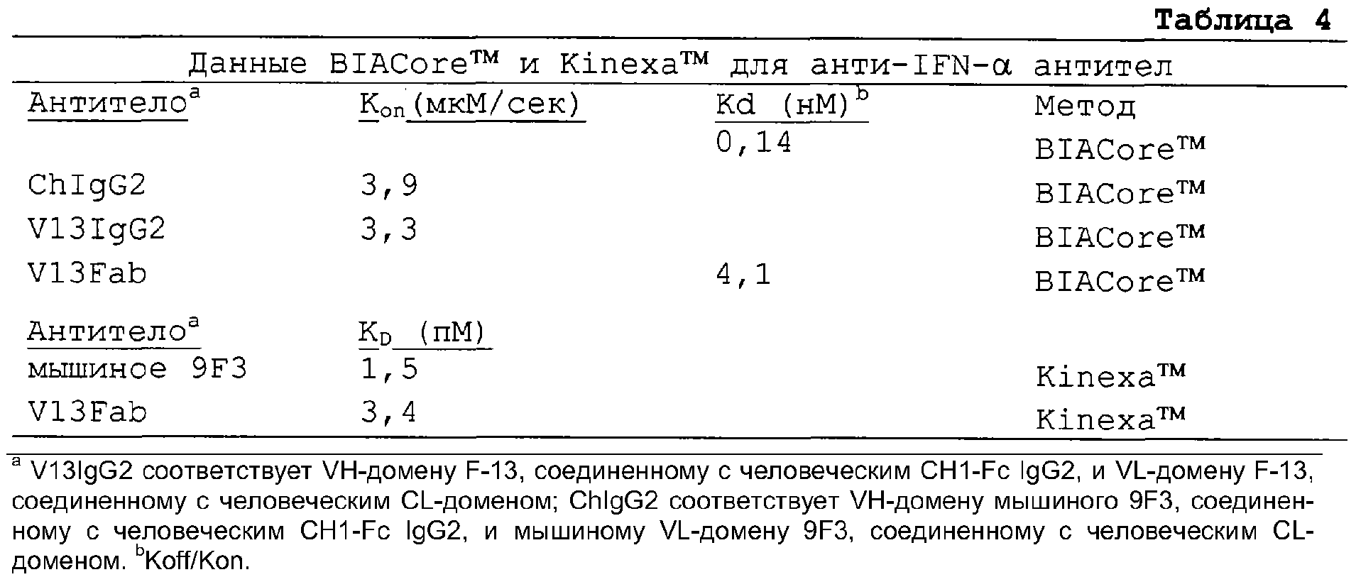 Гуманизированное рекомбинантное анти-IFN- моноклональное антитело (V13IgG2) создают путем слияния доменов VH и VL, полученных из F-13, соответственно для CH1-Fc человеческого IgG2 и человеческих CL-доменов. Затем уровни KON и величины KD V13IgG2 сравнивают с химерным IgG2 или мышиным 9F3. BIACore -измерение связывания V13IgG2 и химерного IgG2 с иммобилизованным IFN- свидетельствует, что их KON-уровни сходны (Таблица 4). Измерение сродства с использованием Kinexa -технологии показывает, что сродство V13IgG2 с IFN- снижено в 2 раза по сравнению с родительским мышиным антителом 9F3 (Таблица 4).