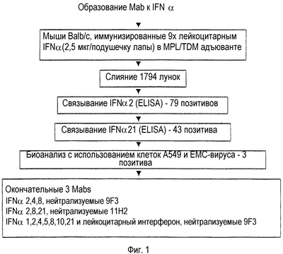 Биологическая активность IFN- человеческого индивида может представлять собой противовирусную активность. В одном из вариантов осуществления настоящего изобретения моноклональное антитело против IFN- человека способно связываться со всеми или практически со всеми подтипами IFN- человека и нейтрализовать их противовирусную активность. В другом варианте осуществления настоящего изобретения моноклональное антитело против IFN- человека способно связываться и нейтрализовать противовирусную активность каждого подтипа IFN- человека – 1, 2, 4, 5, 8, 10 и 21. В конкретном варианте осуществления настоящего изобретения создано моноклональное антитело против IFN- человека, которое способно связываться и нейтрализовать, по меньшей мере, 60% или, по меньшей мере, 70%, предпочтительно, по меньшей мере, 75%, более предпочтительно, по меньшей мере, 80%, еще более предпочтительно, по меньшей мере, 85%, еще более предпочтительно, по меньшей мере, 90%, еще более предпочтительно, по меньшей мере, 95%, наиболее предпочтительно, по меньшей мере, 99% противовирусной активности всех или практически всех подтипов IFN- человека. Еще в одном варианте осуществления настоящего изобретения создано моноклональное антитело против IFN- человека, которое связывает и нейтрализует, по меньшей мере, 60% или, по меньшей мере, 70%, предпочтительно, по меньшей мере, 75%, более предпочтительно, по меньшей мере, 80%, еще более предпочтительно, по меньшей мере, 85%, еще более предпочтительно, по меньшей мере, 90%, еще более предпочтительно, по меньшей мере, 95%, наиболее предпочтительно, по меньшей мере, 99% противовирусной активности каждого подтипа IFN- человека – 1, 2, 4, 5, 8, 10 и 21. Еще в одном варианте осуществления настоящего изобретения моноклональное антитело, нейтрализующее противовирусную активность IFN- человека, не нейтрализуют противовирусную активность IFN- человека.
