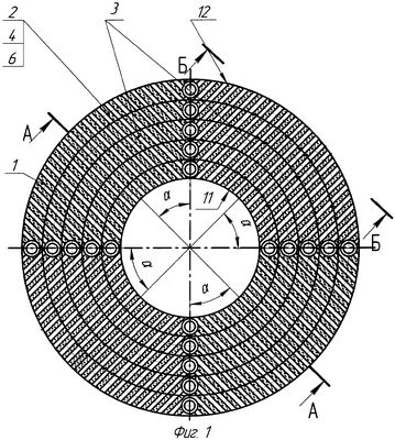 Волокнистая суспензия поступает под давлением в межножевую рабочую полость через входные окружные кромки 11. Ножи 4 роторных колец 1 захватывают массу и отбрасывают в межножевые канавки 14 статорных колец 1. При этом на волокнистую суспензию оказывается ударное воздействие о боковые поверхности статорных ножей 4.