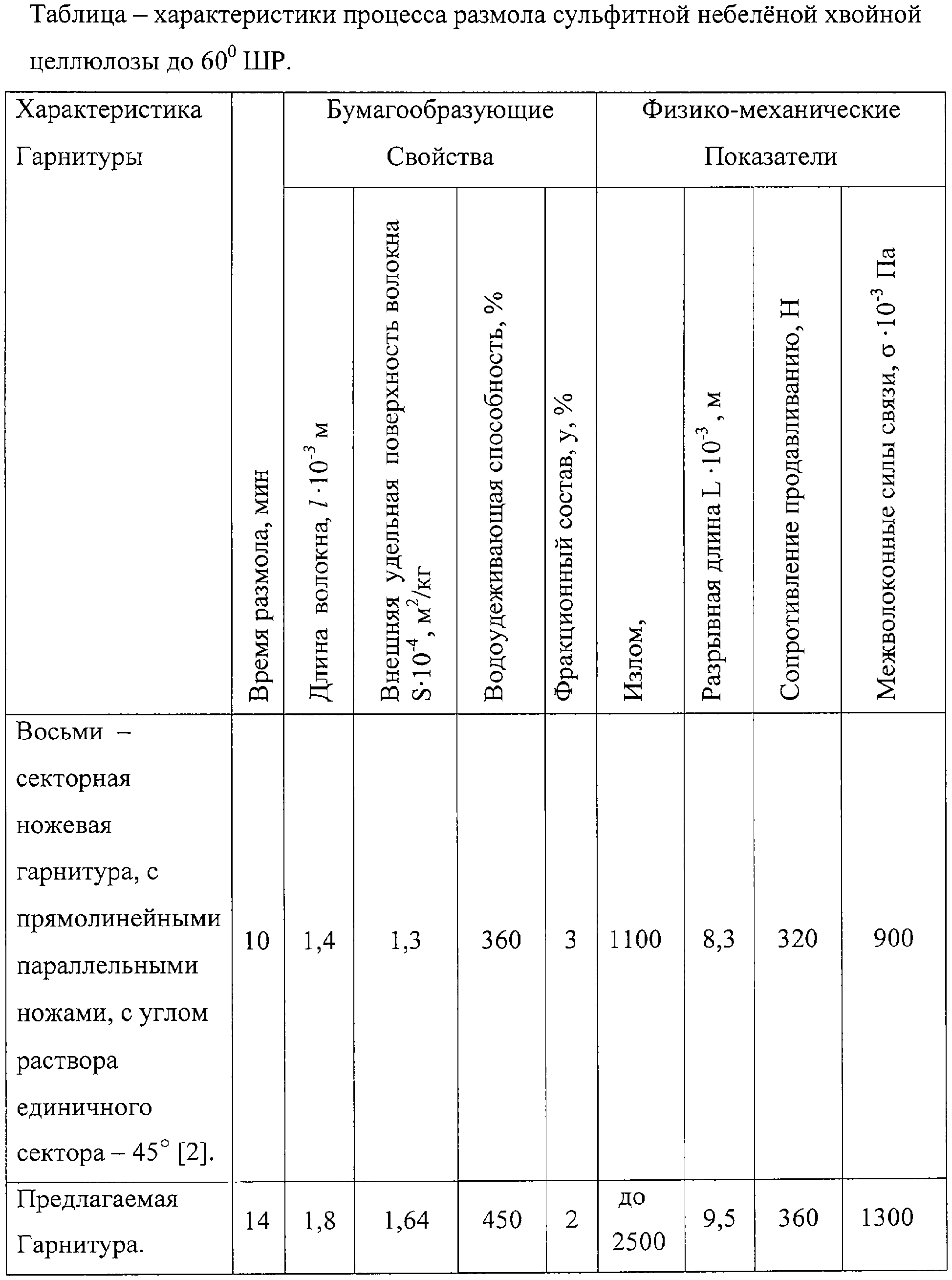 Ширина ножей и ячеек роторного и статорного дисков – 4 мм. Сравнительные показатели работы обоих гарнитур приведены в таблице. По сравнению с известной гарнитурой [2] предлагаемая гарнитура позволяет обеспечить продукт высокими бумагообразующими свойствами и физико-механическими показателями отливок при минимальном укорочении волокна.