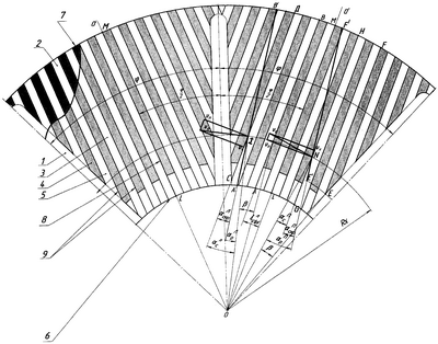 Размалывающая гарнитура для дисковой мельницы работает следующим образом. Волокнистый полуфабрикат под давлением поступает через внутреннюю окружную кромку 6 в рабочую кольцевую междисковую полость и по ячейкам 5 устремляется в направлении наружной окружной кромки 7. После поворота роторного диска 1 на угол (см. чертеж) режущие кромки 9 (АВ и EF) перемещаются в положение А’В’ и E’F’. В точках I и N пересечения их с режущими кромками 9 (CD и GH) статорного диска 2, лежащих на окружности с произвольным радиусом Rx, выделены векторы окружной скорости Vo, разложенной на касательные V и нормальные Vn составляющие.