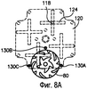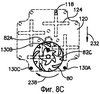 Обращаясь сначала к фиг.8А, отметим, что управляющий элемент 120 показан в своем нейтральном положении так, что штифт 118 элемента 110 направляющей дорожки расположен в центре внутри крестообразного углубления 124. В этом положении ни один из штырей 130А, 130В или 130С следящего механизма не зацеплен ни с одним из зубцов барабанного кулачка 80.