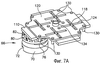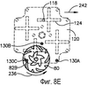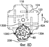Ниже описаны фиг.7 и 8, изображающие управляющий механизм по настоящему изобретению. На фиг.7А и 7В управляющий элемент 120 показан над элементом 110 направляющей дорожки и с одним замковым узлом 66. Из этих чертежей также видно, что управляющий элемент 120 способен только на двухкоординатное смещение вследствие выступания штифтов 118 от элемента 110 направляющей дорожки в соответствующие крестообразные углубления 124 управляющего элемента 120. В соответствии с вариантом осуществления изобретения управляющий элемент 120 смещается в нейтральное положение фиг.7А одной или более подходящими пружинами (не показаны).