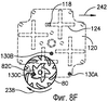 На фиг.8A-8F изображен наложенный вид сверху, показывающий пунктирными линиями управляющий элемент 120 и сплошными линиями барабанный кулачок 80. Как уже упомянуто выше, управляющий элемент 120 содержит четыре набора из трех штырей 130 следящего механизма, где каждый набор соответствует одному замковому узлу 66. На фиг.8A-8F этот набор штырей следящего механизма, который соответствует показанному барабанному кулачку 80, показан пунктирными линиями для того, чтобы отличить его от других наборов штырей следящего механизма, не показанных пунктирными линиями. Для объяснения последовательности манипуляций, рассматриваемые штыри следящего механизма обозначены ссылочными позициями 130А, 130В и 130С. Дополнительно имеется показанный один штифт 118 (другие удалены для ясности), выступающий от элемента 110 направляющей дорожки (не показан), способный скользить внутри крестообразного углубления 124.