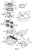 Также имеется расположенный на центральном опорном штыре 50 звездообразный элемент 88 возврата, образованный четырьмя плечами 90, каждый из которых выполнен на своем конце с плоской поверхностью 94 зацепляющего кулачка.