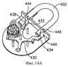 После манипулирования стопорным механизмом в его незапертое положение (фиг.14 В) стопорные ушки выступают в соответствующие периферийные углубления дисковых элементов, посредством чего стопорный элемент перемещается в направлении против часовой стрелки, вызывая соответствующее смещение зацепляющих элементов 438 и 440 задвижки вправо, отцепляясь от стопорных задвижек 444 и 446 соответственно, таким образом обеспечивая возможность извлечь скобу 440, как на фиг.14С.