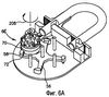 В положении на фиг.6В после того, как стопорный элемент 56 выполняет свое угловое смещение в зацепление с углублениями 72, скобу 30 можно вытянуть в направлении стрелки 214, где на первом этапе это повлечет за собой скользящее смещение стопорного пролома 140 в направлении стрелки 218, а затем произойдет отцепление от него, обеспечивая возможность осевого смещения скобы и ее извлечения. Однако следует отметить, что с помощью другой модификации (не показана) более длинная нога 31 скобы 30 остается запертой внутри защитного цилиндра 34.