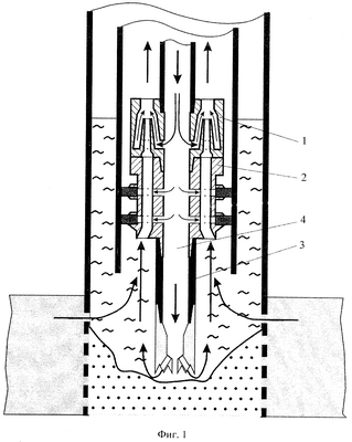 В качестве прототипа выбрано устройство для очистки песчаных пробок, описанное в способе промывки скважин (см. а.с. №106714 от 16.10.54 г. по кл. Е21В 21/00). Устройство состоит из струйного насоса, узла разобщения, включающего патрубок, коаксиально установленный в корпусе (сдвоенный кожух) с образованием всасывающего кольцевого канала (кольцевого пространства), верхний и нижний пакерующие элементы (самоуплотняющиеся манжеты), расположенные на корпусе, и узла разрушения, жестко связанных между собой и имеющих общий осевой гидравлический канал. В устройстве струйный насос расположен под узлом разобщения, а в качестве узла разрушения содержит сопла.