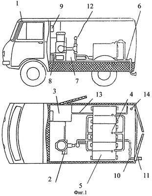 На фиг.1 изображен вариант выполнения устройства для обработки нефтяных скважин, в котором все блоки устройства установлены в фургоне транспортного средства, выполненного с возможностью перевозки упомянутых блоков от одной скважины куста нефтяных скважин к другой.