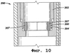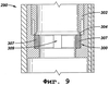 Другие варианты осуществления находятся в пределах объема притязаний прилагаемой формулы изобретения. Например, рассмотрим фиг.9, на которой показан вариант, при котором в клапане 290 (который заменяет клапан 14) цанговый патрон 30 может быть заменен пружинным кольцом 300. Клапан 290 имеет в общем такую же конструкцию, как клапан 14, за исключением пружинного кольца 300 и следующих различий. Пружинное кольцо 300 в некоторых вариантах осуществления изобретения включает единственную открытую прорезь 309, когда клапан не находится в состоянии захвата шара. Таким образом, как изображено на фиг.9, в этом состоянии оправка 302 расположена над пружинным кольцом 300 так, что открытые концы 307 пружинного кольца 300 не сжаты, чтобы закрыть прорезь 309. Конец 304 оправки 302 может быть наклонным или скошенным в некоторых вариантах осуществления изобретения так, чтобы когда оправка 302 скользила вниз, как изображено на фиг.10, концы 307 входили в контакт, закрывая прорезь 309 (фиг.9) и, таким образом, ограничивали внутренний диаметр через пружинное кольцо 300. В состоянии, которое изображено на фиг.10, клапан находится в состоянии захвата шара, поскольку внутренний диаметр ограничен для захвата свободнопадающего или нагнетаемого насосом вниз объекта.
