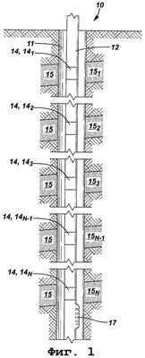В качестве более характерного примера шар можно забрасывать с поверхности скважины в центральный проход колонны 12 с целью открытия предварительно неоткрытого клапана 14N, который предварительно был установлен в состояние захвата шара. В ответ на давление жидкости, которое применяется к получаемому в результате ограниченному центральному проходу, клапан 14N открывается, обеспечивая возможность операции разрыва, которую нужно выполнять на связанном слое 15N. Открывание клапана 14N, в свою очередь, помещает следующий клапан 14N-1 в последовательности в состояние захвата шара. Как только операция разрыва на слое 15N закончена, в центральный проход колонны 12 забрасывают другой шар с целью открытия клапана 14N-1, чтобы можно было разорвать слой 15N-1. Таким образом, эта последовательность продолжается до тех пор, пока последний клапан 141 не будет открыт, а связанный слой 151 разорван.