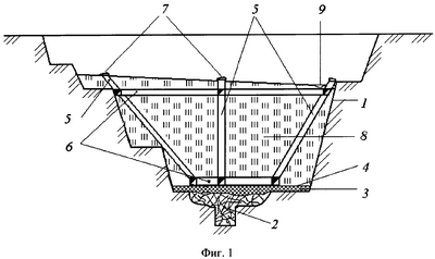 В подлежащем рекультивации выработанном пространстве 1 карьера или зоны обрушения проводят погашение всех пустот 2 под дном выработанного пространства, например, взрыванием потолочин. Затем на дно выработанного пространства 1 размещают слой теплоизолирующего материала 3, например торфа, доменного шлака и т.п., и покрывают его водонепроницаемой пленкой 4, например полиэтиленовой. После этого начинают строить первую часть взаимосвязанной системы вертикальных и наклонных выработок в виде колодцев 5 и горизонтальных галерей 6. Колодцы 5 имеют выходы на дневную поверхность, снабженные теплоизолированными крышками 7. Для исключения проникновения льда в эти выработки при его протаивании стенки выполняют сплошными, например, в виде сруба из бревен или набором железобетонных панелей. С наступлением устойчивых отрицательных температур, когда глубина промерзания достигает величин более метра, а температура атмосферного воздуха ниже минус 20°С, приступают к намораживанию ледяного массива 8, например, с помощью установки «Град», позволяющей, как показывает опыт ее использования /2/, создавать ледяные массивы мощностью более 100 м.