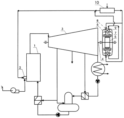 В котел 1 через горелку 2 подают природный газ и воздух. Вырабатываемый в котле 1 пар направляют в турбину 3, вал 4 которой соединен с ротором 5 турбогенератора 6, осуществляют постоянное охлаждение обмоток и стали турбогенератора 6 путем циркуляции водорода через его внутреннее пространство, циркуляционный водород охлаждают в газоохладителях 7. Газ, необходимый для работы котла, редуцируют в вихревой трубе 10, холодный газовый поток пропускают через газоохладители 7 и подают по газопроводу в топку 2 котла 1, горячий газовый поток подают в топку 1, минуя газоохладители 7.