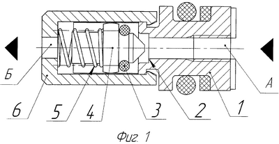 Клапан работает следующим образом: при подаче давления со стороны полости А затвор 4 под действием давления рабочего тела преодолевает усилие пружины 5, перемещается влево, пропуская давление рабочего тела в полость Б.