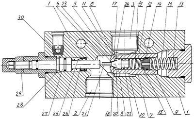 Таким образом, положение золотника 7, регулирующего основной поток рабочей жидкости, зависит от положения затвора 20, регулирующего параллельный поток рабочей жидкости, управление которым обеспечивается толкателем 26 за счет давления в управляющей полости или винтом 29.