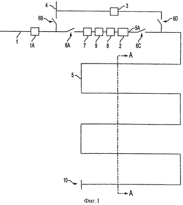 Фиг.1 схематически показывает общий вид одного варианта выполнения установки по изобретению применительно к установкам для хранения при использовании конечными пользователями. Как показано на фиг.1, установка по настоящему изобретению предпочтительно содержит блок (2) компрессора, соединенный с коммунальной линией (1) от коммунальной компании или другого поставщика природного газа, для сжатия газа до желаемого давления установки, блок (3) снижения давления, соединенный с линией (4) потребления конечного пользователя, для снижения давления газа до уровня, необходимого для потребления конечным пользователем, и по крайней мере одна компактная, сконструированная сплошной система (5) хранения в стальных трубах для хранения природного газа в сжатом виде, при этом система (5) хранения в трубах соединена как с блоком (2) компрессора, чтобы получать сжатый газ от коммунальной линии (1), так и с блоком (3) снижения давления для выдачи газа из установки в линию (4) потребления. Изобретение далее содержит средства удержания хранящегося газа внутри системы (5) хранения в трубах за исключением момента, когда упомянутая система (5) заполнена либо когда газ внутри нее находится в процессе подачи в линию (4) потребления конечного пользователя, и средство управления доставкой газа из коммунальной линии (1) в систему (5) хранения в трубах, а также доставкой газа из системы (5) в линию (4) потребления конечного пользователя. Коммунальная линия (1) уже должна быть соединена через измеритель 1А и регулирующий клапан (6В) с линией (4) потребления конечного пользователя для немедленного использования природного газа, доставленного к конечному пользователю; настоящее изобретение является модификацией этого соединения, позволяя природному газу течь в систему (5) хранения в трубах, когда это желательно для конечного пользователя.