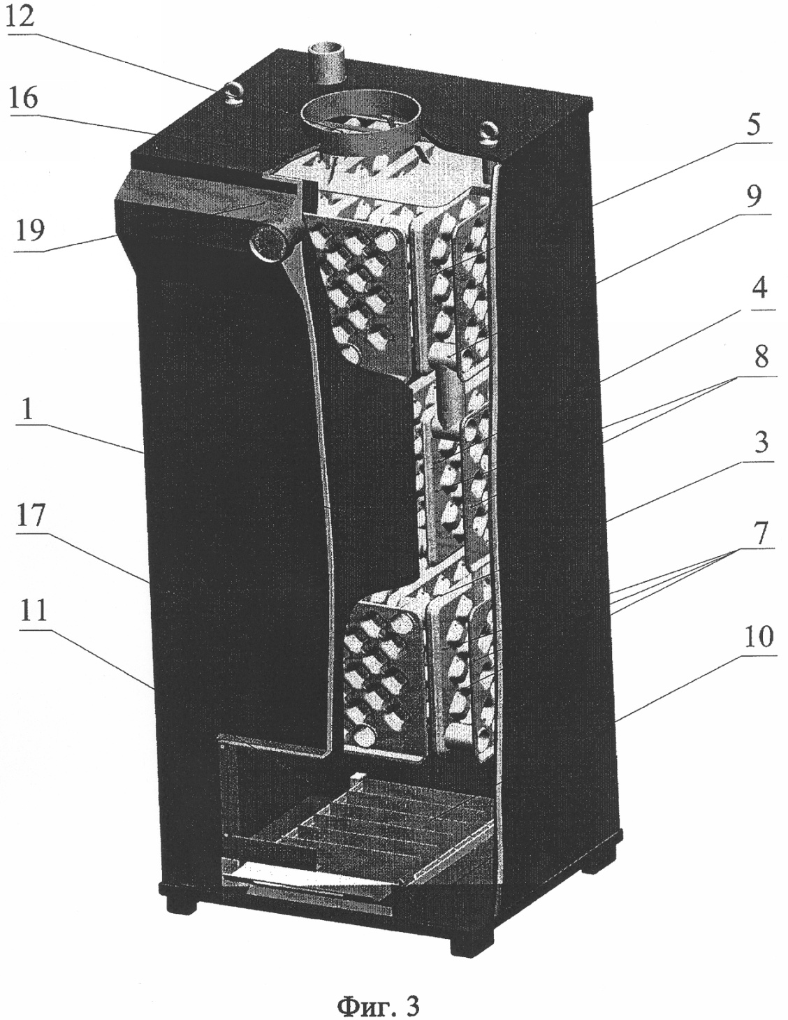 На фиг.3 – аксонометрическое изображение котла отопительного.