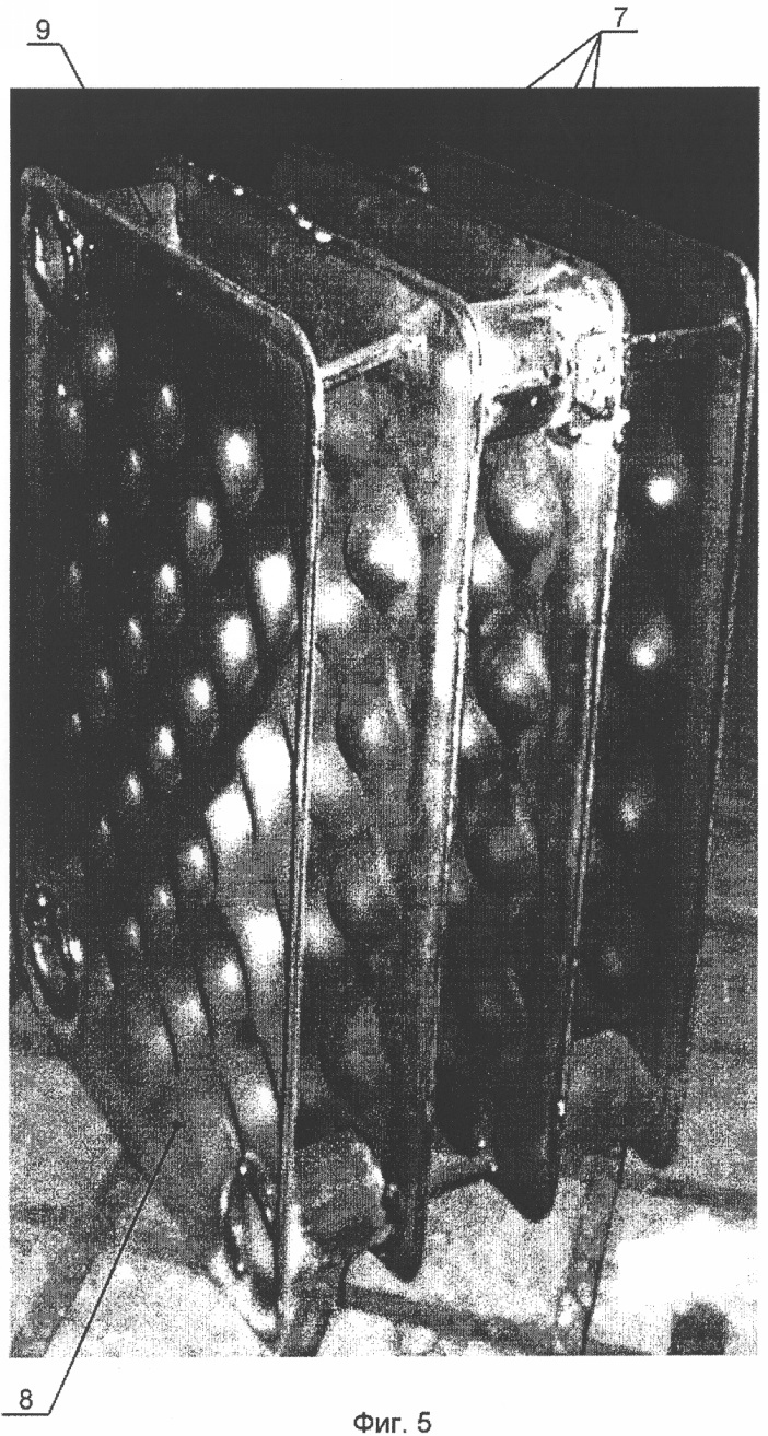 – наряду с условием полноты сгорания, задача повышения эффективности котла, его КПД, решается применением в кассете 8, как элементе теплообменника, выпукло-полых поверхностей в виде призм, позволяющих получить максимальную теплопередачу за счет интенсивной турбулентности газового потока продуктов сгорания и перемешивания теплоносителя при относительно низком сопротивлении трактов, как гидравлического, так и газового.