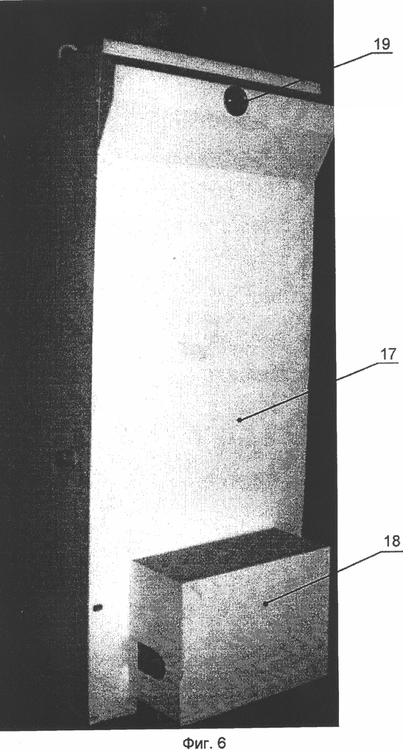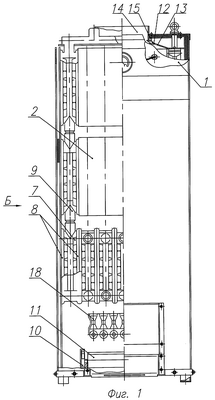 – при ситуации опрокидывания тяги в дымоходе 14 схема газодинамики процессов в топке 1 – обратная: сопротивление газового потока также удерживает стабильным давление в топке, так как в основной массе, встречая на пути отражатель 13, уходит через зазор между дымоходом 14 и отражателем 13 в периферийную зону наименьшего сопротивления, причем, достигая огневого фронта горелки 18, перемещается в зону наибольшего разогрева в центр на дожиг, чем создаются условия стабильности и полноты сгорания топлива в расчетных параметрах, обеспечивая минимальный выброс вредных примесей в окружающую среду, что способствует одновременно и повышению коэффициента полезного действия котла;