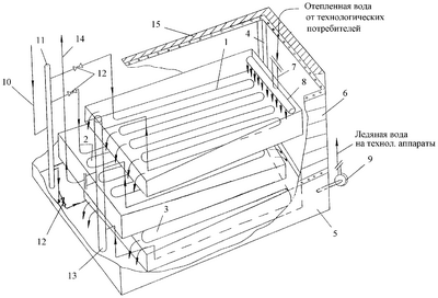 Испаритель для охлаждения теплоносителей содержит горизонтально размещенные и обрамленные листовым железом панели 1, 2, 3 (вместо панелей можно использовать змеевиковые или коллекторные батареи, горизонтально размещенные в поддонах с переменной высотой боковых и торцовых стенок), размещенные в металлическом каркасе 4, жестко соединенном с металлическим поддоном 5 и герметично закрытом по периметру пластиковыми листами 6 и покрытом теплоизоляцией 15, патрубок 7 с перфорированным коллектором 8, насос 9 для подачи теплоносителя к потребителям, жидкостной трубопровод 10 с жидкостным коллектором 11 и регулирующими вентилями 12, паровой коллектор 13 с трубопроводом отсоса паров хладагента 14.
