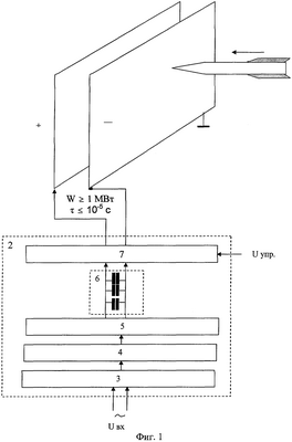 Данное изобретение не ограничивается вышеприведенным примером его осуществления. В рамках данного изобретения возможно и другое исполнение элементов предложенного вида оружия ПВО. Так высоковольтный трансформатор 3, выпрямитель 4, емкостной умножитель 5 напряжения емкостного накопителя 2 энергии могут быть выполнены в виде отдельного зарядного устройства. При достаточном входном напряжении умножитель напряжения 5 может быть исключен из схемы зарядного устройства. Для уменьшения весогабаритных параметров зарядное устройство может быть дополнительно снабжено преобразователем частоты с 50 Гц до 400 Гц, установленным на входе высоковольтного трансформатора. При этом трансформатор 3 может быть выполнен на облегченных ферритовых магнитопроводах.