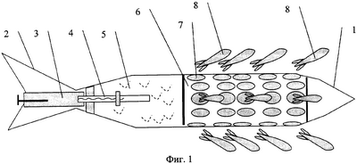 1. Противовоздушная пучковая мина барьерного оружия, содержащая обтекаемый корпус с раскрывающимся стабилизатором и с последовательно установленными внутри корпуса пороховым ускорителем, блоком временной задержки и заградительной боевой частью, отличающаяся тем, что она дополнительно содержит вышибной заряд, заградительная боевая часть содержит блок пусковых труб, установленных веерообразно под переменными углами относительно продольной оси мины, а в пусковых трубах установлены миниснаряды, содержащие обтекаемый корпус, снабженный стабилизатором и энергоактивным поражающим элементом.