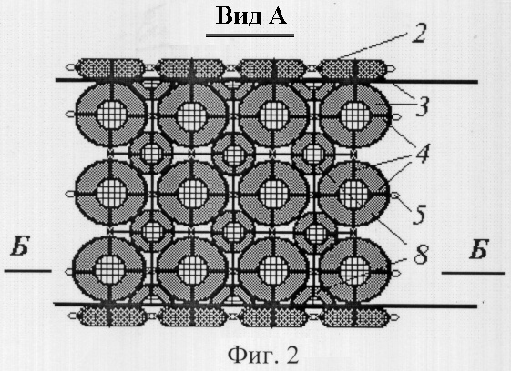 Укрытие мест взрыва из автомобильных шин представлено на фиг.1 (вид укрытия сбоку), фиг.2 (вид по стрелке А на фиг.1) и фиг.3 (сечение Б-Б на фиг.2).