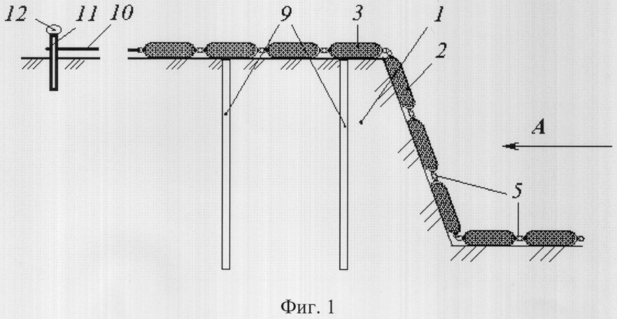 На подошве уступа 1 собирают однослойный мат 2 из отдельных изношенных автомобильных шин 3, размер которых по диаметру подбирают, исходя из высоты уступа, чтобы перегиб мата по верхней и нижней бровкам уступа проходил по местам соединения отдельных шин. Диапазон размеров шин большегрузных автосамосвалов, например, типа БелАЗ достаточно широк: от 1,6 м у БелАЗ-540 до 3,1 м у БелАЗ-7519 [2]. Для соединения шин в однослойном мате 2 на них диаметрально противоположно, крест-накрест закрепляют хомуты 4 из полосового металла, снабженные соединительными элементами 5, например крюками и серьгами. Соединение изношенных шин 3 элементами 5 через хомуты 4 позволяет при возникновении нагрузок в момент взрыва использовать для их поглощения упругую деформацию шин 3 и их трение о поверхность горной массы. Для уменьшения размера куска породы, который может быть выброшен через внутреннее отверстие шины 3, достигающее 0,6 м у шин БелАЗ-540 и 1,3 м у шин БелАЗ-7519, внутрь шин устанавливают решетки или сетки из цепей 6. Их закрепляют на хомутах 4 с помощью гибких связей 7, выполненных, например, из цепей со значительной слабиной, позволяющей решетке или цепной сетке 6 перемещаться по высоте, что повысит их демпфирующую способность и устойчивость к динамическому воздействию. Размер окон решетки определяется необходимой степенью защиты охраняемого объекта по размеру кусков горной массы, поскольку дальность разлета кусков зависит от их размера. Затем в зазоры между шинами крупного размера вставляют шины 8 меньшего размера с такими же элементами 4 и 5, как и шин большого размера. При этом в местах перегиба мата на бровках уступа вставляют шины малого размера, разделенные пополам, чтобы они могли огибать уступ по бровкам. Например, шины 3 могут быть использованы от БелАЗ-7519 диаметром 3,1 м, а малого размера 8 – от БелАЗ-540, диаметром 1,6 м. Однослойный мат 2 собирают либо сразу на всю ширину укрываемого объема либо в виде отдельных полос по длине откоса и поверхности уступа, а затем соединяют несколько полос после размещения на укрываемом объеме в единое укрытие, используя для этого вспомогательные механизмы, например автомобильные вышки.