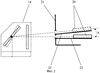 На поверхность спектроделительной пластины 10, обращенную к заркальному коллиматору 1, нанесено спектроделительное покрытие, отражающее тепловое излучение и пропускающее видимое излучение. Компенсатор ошибок направления световых пучков 11 выполнен в виде двух последовательно расположенных клиновидных пластин, установленных с возможностью вращения вокруг оси первого канала. На оси второго канала расположены последовательно плоское зеркало 12 и защитное стекло 13, пропускающее тепловое излучение. Плоское зеркало 12 установлено параллельно спектроделительной пластине 10 и жестко связано с ней, например, путем приклеивания к торцам титановой трубки. Оптический блок сопряжения установлен по ходу лучей, выходящих из зеркального коллиматора 1. На фиг.1 показан также контролируемый комбинированный прицел 14 (для отличия от заявляемого устройства на чертеже выполнен штриховой линией), включающий визуальный и тепловизионный каналы. На оси визуального канала, в фокальной плоскости объектива 15, установлена сетка 16, которая рассматривается через окуляр 17 визуального канала. Центральная марка на сетке 16 определяет положение визирной оси визуального канала. На оси тепловизионного канала установлена тепловизионная камера 18, выход которой подключен к видеосмотровому устройству 19. Марка, рассматриваемая на видеосмотровом устройстве 19, определяет положение визирной оси тепловизионного канала. Расстояние между осями первого и второго каналов оптического блока сопряжения равно расстоянию между осями визуального и тепловизионного каналов комбинированного прицела 14. При выполнении проверок зеркальный коллиматор с оптическим блоком сопряжения 20 устанавливается на выходе комбинированного прицела 14, при этом визуальный канал комбинированного прицела должен находиться по ходу лучей первого канала оптического блока сопряжения, тепловизионный канал – по ходу лучей второго канала оптического блока сопряжения. Все элементы схемы оптически сопряжены друг с другом. Зеркальный коллиматор с оптическим блоком сопряжения 20, см. фиг.2, имеет возможность разворота вокруг горизонтальной оси, перпендикулярной визирной оси визуального канала комбинированного прицела, с возможностью фиксации по меньшей мере в двух положениях, что позволяет проводить контроль положения визирной оси тепловизионного канала комбинированного прицела относительно его визирной оси визуального канала при повороте этих осей в вертикальной плоскости.