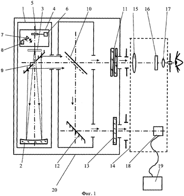 Пучок лучей от источника излучения 4 зеркального коллиматора, состоящий из лучей видимого и теплового излучения, освещает сетку 3, затем пройдя через отверстие в зеркале 9, падает на отражающую поверхность зеркального объектива 2, отражается от нее и падает на зеркало 9. Отразившись от зеркальной поверхности плоского зеркала 9, пучок лучей падает на спектроделительную пластину. Сетка 3 находится в задней фокальной плоскости зеркального объектива 2, поэтому лучи после отражения от зеркального объектива падают на плоское зеркало 9 и отражаются от него параллельным пучком. Пучок лучей теплового излучения отражается от спектроделительной пластины 10, затем от плоского зеркала 12 проходит через защитное стекло 13 и входит в тепловизионный канал контролируемого комбинированного прицела 14. В плоскости тепловизионной камеры 18 тепловизионного канала, выход которой подключен к видеосмотровому устройству 19, формируется изображение сетки зеркального коллиматора, которое рассматривается наблюдателем на видеосмотровом устройстве 19 одновременно с маркой тепловизионного канала, определяющей положение визирной оси тепловизионного канала.