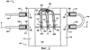 На фиг.4 показан вид в разрезе, выполненный по линии 4-4 на фиг.2. На фиг.4 показаны все элементы, показанные на фиг.3, а также элементы соединителей 108 и 109. На фиг.4 также показаны отверстия 402 и 404 в основании 101. Верхняя часть каждого из этих отверстий проходит к нижней поверхности основания датчиков LPO, RPO и возбудителя D. На фиг.4 также показаны катушка С и магнит М, связанные с каждым из этих элементов. Измерительное электронное устройство 121, показанное на фиг.1, на фиг.3 и 4 не показано для упрощения чертежей. Элементом 405 в соединителе 108 является входной конец расходомерной трубки 102; элементом 406 в соединителе 109 является выходной конец расходомерной трубки 102.