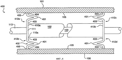 Можно заметить, что изменения температуры расходомерной трубки 103 передаются стержню 111 растяжки, балансировочному стержню 102 и опоре 403 соединительного звена 412 кожуха. Однако из-за присутствия сгиба 401 и его раструба 402 соединительное звено 412 кожуха может поглощать сжатие или расширение по длине опоры 403 без какого-либо повреждения конструкции соединительного звена кожуха 412 или элементов, с которыми оно соединено. Вид с торца фиг.4 аналогичен фиг.3 за исключением того, что звенья 112а и 112b не содержат сгиб 401 звеньев 412. Элементы 405 и 406 представляют собой соединение опор 404 и внутренней стенки 105 кожуха 101.