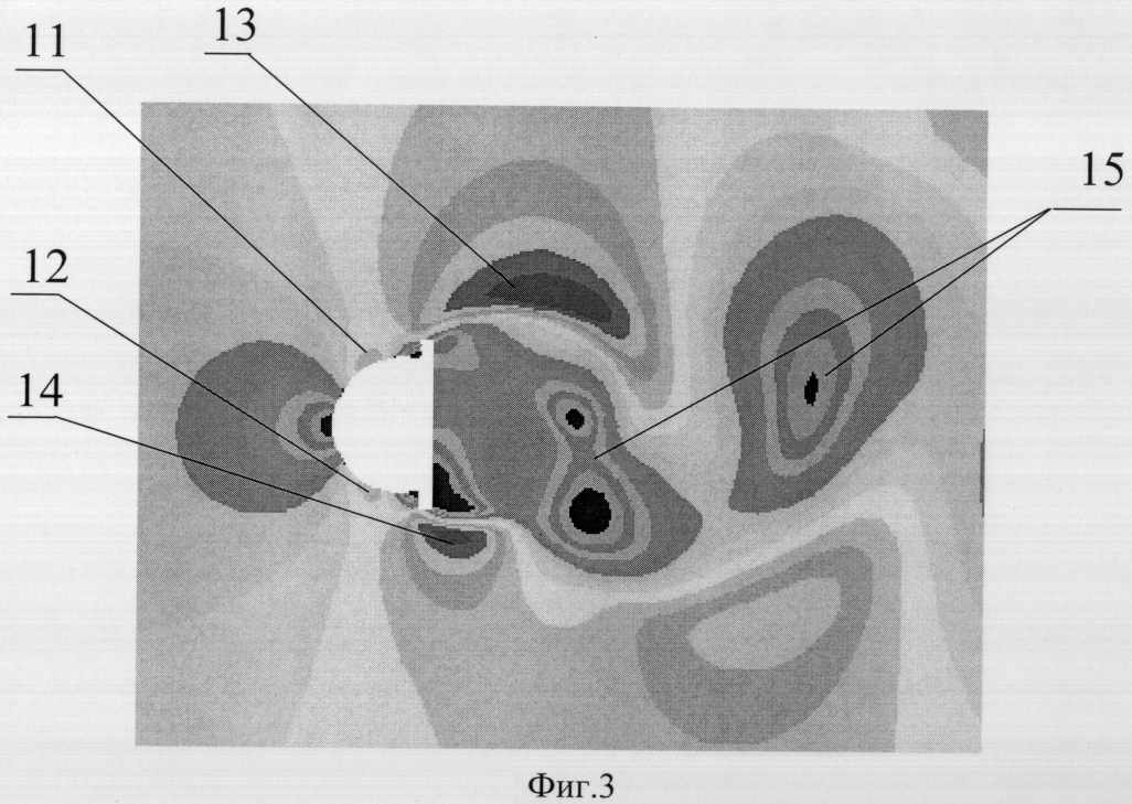 На фиг.3 изображено поле скоростей (изолинии скорости) в плоскости расположения приемных отверстий для заявляемого приемника воздушных давлений, тело которого ограничено частью боковой поверхности кругового конуса, с примыкающей к нему пластиной – 7 для набегающего слева потока, число Маха М =0,5. Более темные места соответствуют максимальным и минимальным значениям скорости газа. Позицией 11 обозначено поле скоростей у части боковой поверхности кругового конуса в районе расположения одного из периферийных приемных отверстий для значения тангенциальной скорости газа V =162 (м/с). Позицией 12 обозначено поле скоростей у части боковой поверхности кругового конуса в районе расположения второго периферийного приемного отверстия для значения тангенциальной скорости газа V =148 (м/с). Позицией 13 обозначено поле скоростей за ребром пластины, максимальное значение скорости газа V =246 (м/с). Позицией 14 обозначено поле скоростей за противоположным ребром пластины, значение тангенциальной скорости газа V =197 (м/с). Позицией 15 обозначена дорожка Кармана за приемником давлений.