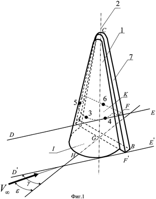 Заявляемый приемник воздушных давлений (см. фиг.1) представляет собой тело, ограниченное частью боковой поверхности кругового конуса – 1, ось которого – 2 предназначена для установки приемника поперек потока, с расположенными на его поверхности центральным – 3 и периферийными – 4, 5 приемными отверстиями, предназначенными для определения направления – (угла скоса потока) и величины скорости потока газа – V , и приемным отверстием – 6, предназначенным для измерения числа Маха и статического давления, расположенным на донной торцевой поверхности приемника – АВС. Приемник содержит пластину – 7, площадь которой превышает площадь грани, образованной сечением кругового конуса плоскостью, а величина площади определяется из условия, что касательная DE (D’E’) к любой части боковой поверхности кругового конуса, проведенная в плоскости сечения приемника К, параллельной плоскости основания – 1, имеющей общую точку с ребром пластины – F (F’), образует угол с линией HG пересечения вертикальной плоскости симметрии приемника с плоскостью основания, больший максимальной величины модуля угла скоса потока.