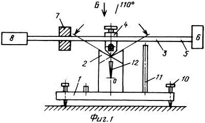 Недостатком известного устройства является то, что узел качения рычага, состоящий из нижней и верхней призм, не позволяет обеспечить требуемую точность измерения статического момента изделий из-за конструкции нижней призмы, в которой в месте пересечения граней образуется радиус перехода их, влияющий на точность измерения. Кроме того, известное устройство со шкалой деления имеет погрешность при измерении, превышающую требуемую точность при определении статического момента изделий.