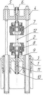 После сборки испытательной машины эталонный образец 12 закрепляется в захватах 7 и 8 и нагружается нагрузкой, превосходящей предельную на 20%. Это положение эталонного образца 12 фиксируется с помощью гайки, являющейся элементом дополнительного шарнира 9, исключающей его как шарнир (и, следовательно, фиксируется соосность захватов 7 и 8). После снятия нагрузки и эталонного образца 12 нижний захват остается зафиксированным в положении, соосном с верхним захватом. Эта соосность сохраняется в дальнейшем при всех механических испытаниях образцов металлов и сплавов на растяжение.