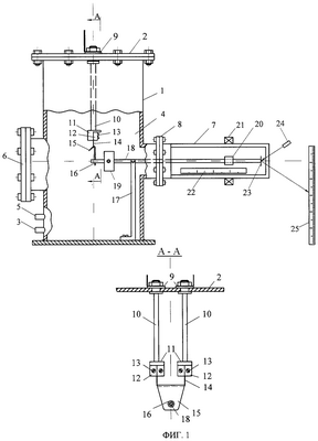Устройство содержит стальной цилиндрический корпус 1, снабженный крышкой 2, отводом 3 для подключения рабочей камеры 4 к вакуумным магистралям (вакуумные магистрали не показаны) и патрубком 5 для впуска в рабочую камеру 4 инертного газа. Стальной цилиндрический корпус 1 содержит иллюминатор 6, а также размещенный горизонтально прозрачный стакан 7, прикрепленный к стальному цилиндрическому корпусу 1 с помощью фланцевого соединения 8. Через крышку 2 (см. вид по А-А, фиг.1) с помощью вакуумных уплотнителей 9 в рабочую камеру 4 введены два металлических держателя 10. Верхние концы держателей 10 подключены к внешнему источнику электрического тока (источник тока не показан), а нижние снабжены металлическими зажимами 11. К зажимам 11 с помощью прижимных пластин 12 и винтов 13 прикреплены концы нитеобразного образца 14, выполненного в виде перевернутой буквы «П». На нижнюю горизонтальную часть нитеобразного образца 14 навешен радиатор 15, который изготовлен в виде изогнутой пластинки, при этом свисающая часть пластинки содержит отверстие 16. Внутри рабочей камеры 4 на опоре 17 размещен механический рычаг 18, свободный конец которого выполнен из токонепроводящего материала и заключен в отверстие 16 радиатора 15. Левое плечо механического рычага 18, расположенное между опорой 17 и радиатором 15, содержит неподвижный груз 19, а другое плечо, размещенное внутри прозрачного цилиндрического корпуса 7, содержит компенсационный груз 20, который может перемещаться вдоль правого плеча рычага 18 с помощью кольцеобразного электромагнита 21. Механический рычаг 18 изготовлен из неферромагнитного материала (в данном случае из молибдена), который сохраняет свою механическую упругость при рабочей температуре в камере. Компенсационный груз 20 изготовлен из ферромагнитного материала (никеля). Точное положение компенсационного груза 20 фиксируется визуально с помощью шкалы 22. На торце правого рычага прикреплено зеркальце 23. Зеркальце 23 вместе с осветителем 24 и шкалой 25 составляют оптическую систему отсчета, позволяющую обнаружить любое сжатие и растяжение образца по длине.
