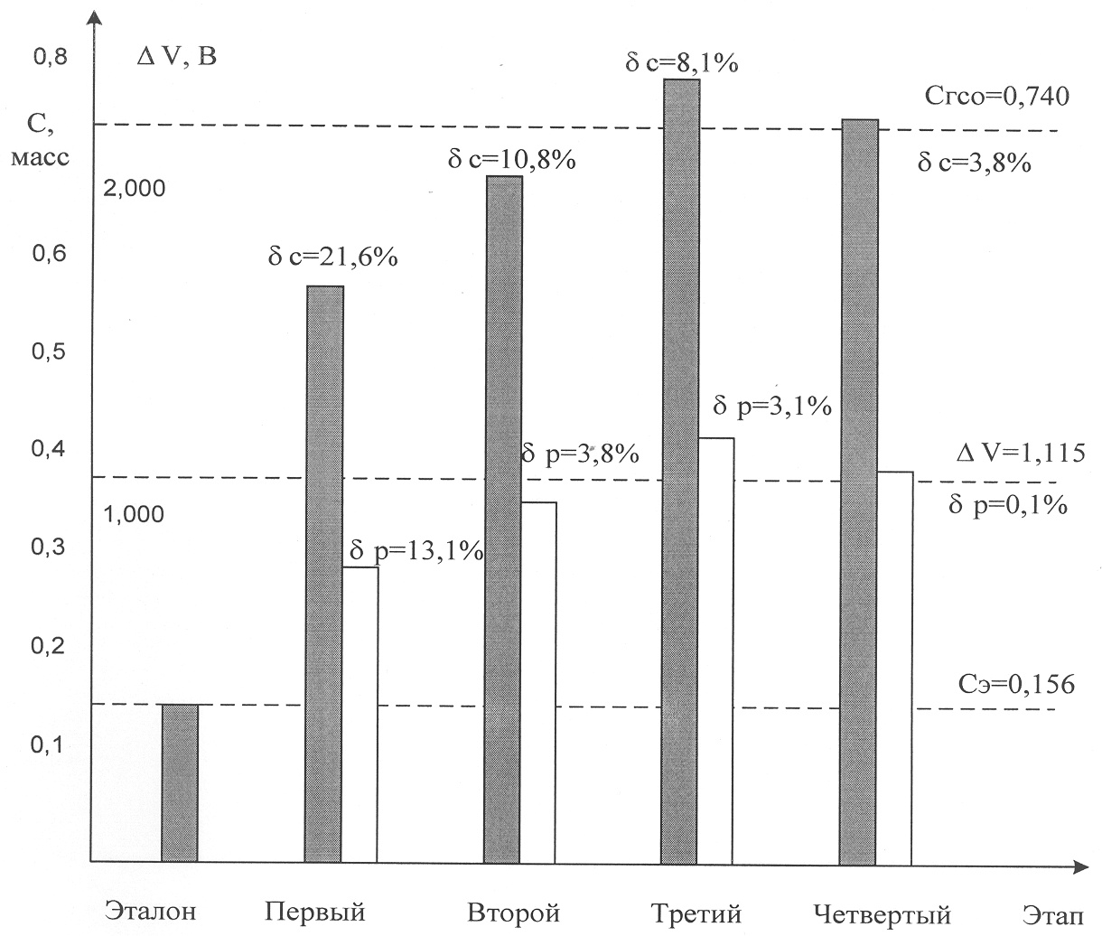 Таким образом, относительная погрешность при определении разности напряжений в эталоне по сравнению с разностью напряжений элемента в пробе на четвертом этапе вычислений составила