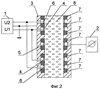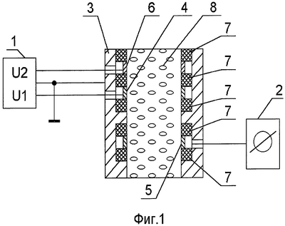 Основной потенциальный электрод 4 и дополнительный потенциальный электрод 6 могут быть выполнены каждый из двух частей, расположенных симметрично относительно измерительного электрода 5. При этом каждая часть основного потенциального электрода 4 подключена к основному, с напряжением U1, выходу высокочастотного генератора 1, а каждая часть дополнительного потенциального электрода 6 – к инверсному, с напряжением U2, выходу высокочастотного генератора 1 (фиг.2). Выполнение основного и дополнительного потенциальных электродов 4 и 6 каждого из двух частей, расположенных симметрично относительно измерительного электрода 5, обеспечивает область нулевого потенциала при входе и выходе потока контролируемого вещества.