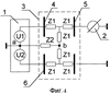 А поскольку в реальных условиях это сопротивление зависит от множества факторов технологического процесса: изменения плотности контролируемой массы вещества, электропроводности вещества, наличия проводящих предметов вблизи электродов емкостного первичного преобразователя и прочее, то точность измерения будет невелика. Однако при наличии в высокочастотном генераторе 1 дополнительного инверсного выхода с напряжением U2, а в емкостном первичном преобразователе – дополнительного потенциального электрода 6, подключенного к дополнительному инверсному выходу генератора 1 (фиг.4), в рабочей области емкостного первичного преобразователя существует область нулевого потенциала под действием двух противофазных напряжений. Эта область нулевого потенциала существует независимо от реальных условий технологического процесса. А поскольку потенциалы общей точки и контролируемой массы вещества – точки «а» и «b», – находящегося в области нулевого потенциала, будут равны, то ток через сопротивление контакта протекать не будет при любом значении этого сопротивления. Следовательно, ток измерительной цепи не зависит от внешних условий, то есть точность измерения повысится.
