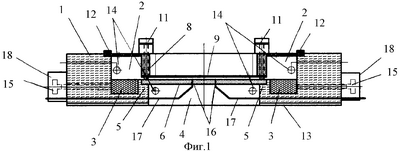 Заявленное устройство содержит платформу 1(фиг.1), имеются резервуары 2, в которых располагаются электроды 3. Платформа имеет ступенчатое отверстие 4, на ступеньке 5 которого крепится предметное стекло 6, на котором закреплен термодатчик 7 (фиг.2). Сверху в отверстие 4 (фиг.1) вставляется рама 8 с закрепленным на ней покровным стеклом 9. Рама 8 плотно прилегает к поверхности отверстия 4 платформы 1, чем достигается невозможность попадания жидкости между стенками рамы и выступами корпуса, а также предотвращается всплывание рамы 8 с покровным стеклом 9 при заполнении камеры жидкостью. При необходимости рама 8 с покровным стеклом 9 может быть жестко закреплена с помощью фиксирующих винтов 10 (фиг.2). В раме 8 (фиг.1) смонтированы микровинты 11, регулирующие расстояние между покровным стеклом 9 и предметным стеклом 6. Сверху резервуары 2 закрываются конденсирующими крышками 12, имеющими одно или несколько отверстий для выхода газообразных продуктов электролиза. На фиг.2 конденсирующие крышки условно не показаны. Снизу на платформу 1 (фиг.1) наклеена прокладка 13 из резины, уменьшающая скольжение камеры по предметному столику микроскопа. Нагревательные элементы 14 располагаются в резервуарах 2 и (или) под предметным стеклом 6. Электроснабжение нагревательных элементов 14 и провода, идущие от термодатчика 7 (фиг.2), а также провода, идущие к контактным винтам 15, на фиг.1 и фиг.2 условно не показаны. В предметном стекле 6 имеются отверстия 16 (фиг.1), в которых закреплены трубки 17, по которым в камеру в процессе работы при необходимости могут быть введены дополнительные растворы и суспензии клеток.