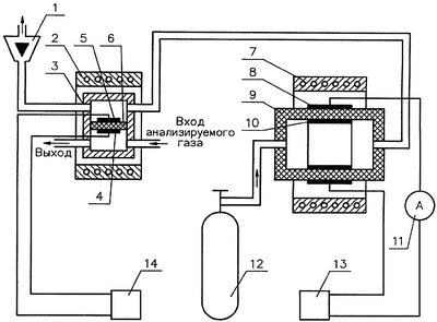 Устройство работает следующим образом. Анализируемый газ с заданным расходом порядка 100÷150 см3/мин проходит через камеру ПТЭЯ, в которой расположен электрод 4. Инертный газ с заданным расходом порядка 50÷100 см3/мин проходит через КТЭЯ и поступает в камеру ПТЭЯ, в которой расположен электрод 5, и далее поступает в измеритель расхода газа. При прохождении инертного газа через КТЭЯ под действием приложенного напряжения к ее электродам осуществляется перенос кислорода по вакансиям кристаллической решетки электролита из атмосферного воздуха в поток инертного газа или из потока инертного газа в атмосферный воздух. Направление переноса кислорода через КТЭЯ зависит от значения ЭДС ПТЭЯ. Если концентрация кислорода в анализируемом газе меньше концентрации кислорода в инертном газе, то под действием приложенного напряжения к электродам КТЭЯ будет осуществляться перенос кислорода из инертного газа в атмосферный воздух до тех пор, пока величина ЭДС ПТЭЯ не станет равной нулю. Если концентрация кислорода в анализируемом газе больше концентрации кислорода в инертном газе, то под действием приложенного напряжения к электродам КТЭЯ будет осуществляться перенос кислорода из атмосферного воздуха в поток инертного газа, пока величина ЭДС ПТЭЯ не станет равной нулю. Направление переноса кислорода через КТЭЯ определяется полярностью напряжения, прикладываемого к электродам. Так, если к внешнему электроду КТЭЯ подсоединить положительный полюс источника напряжения, то будет осуществляться перенос кислорода из инертного газа в атмосферный воздух и при изменении полярности будет осуществляться перенос кислорода из атмосферного воздуха в поток инертного газа. Согласно уравнению (1) значение ЭДС ПТЭЯ будет равно нулю при условии, что Сx=С0.