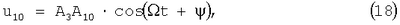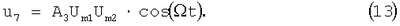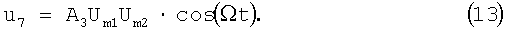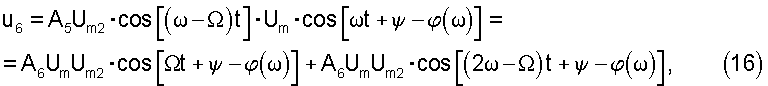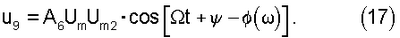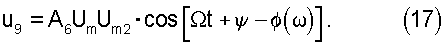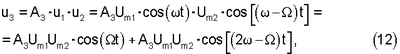 Поскольку на второй вход перемножителя 6 подается сигнал u2, на вход ФНЧ 9 поступает напряжение