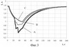 На фиг.3 представлены осциллограммы токов в случае нарушения контактной системы РПН («подгар» в дугогасительных и главных контактах). Очевидно, что при таких дефектах осциллограммы токов по абсолютной величине будут значительно меньше по сравнению с осциллограммой тока на фазе, где отсутствует дефект. В нашем случае на фиг.3 на фазах А и В токи значительно меньше по сравнению с токами на фазе С. Наоборот, при витковых замыканиях в токоограничивающих сопротивлениях осциллографируемый ток по абсолютной величине окажется значительно больше по сравнению с током, измеренным при пусконаладочных испытаниях РПН (не показан).